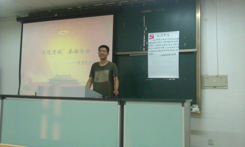 活动开始,孙扬同志便指出各预备党员和入党积极分子要对“坚持诚信考试,文明考试”作出承诺,自愿恪守“笃学尚性,和谐卓越”的院训,时刻以一名共产党员的标准严格要求自己,以诚实守信的态度参加考试。紧接着,由第二党支部书记陈好发表讲话,她表示:我们要端正考试态度,增强对考试作弊的后果严重性的认识,做到认真学习,脚踏实地,诚信守信,在今后的生活中,展现自我形象的良好风尚。