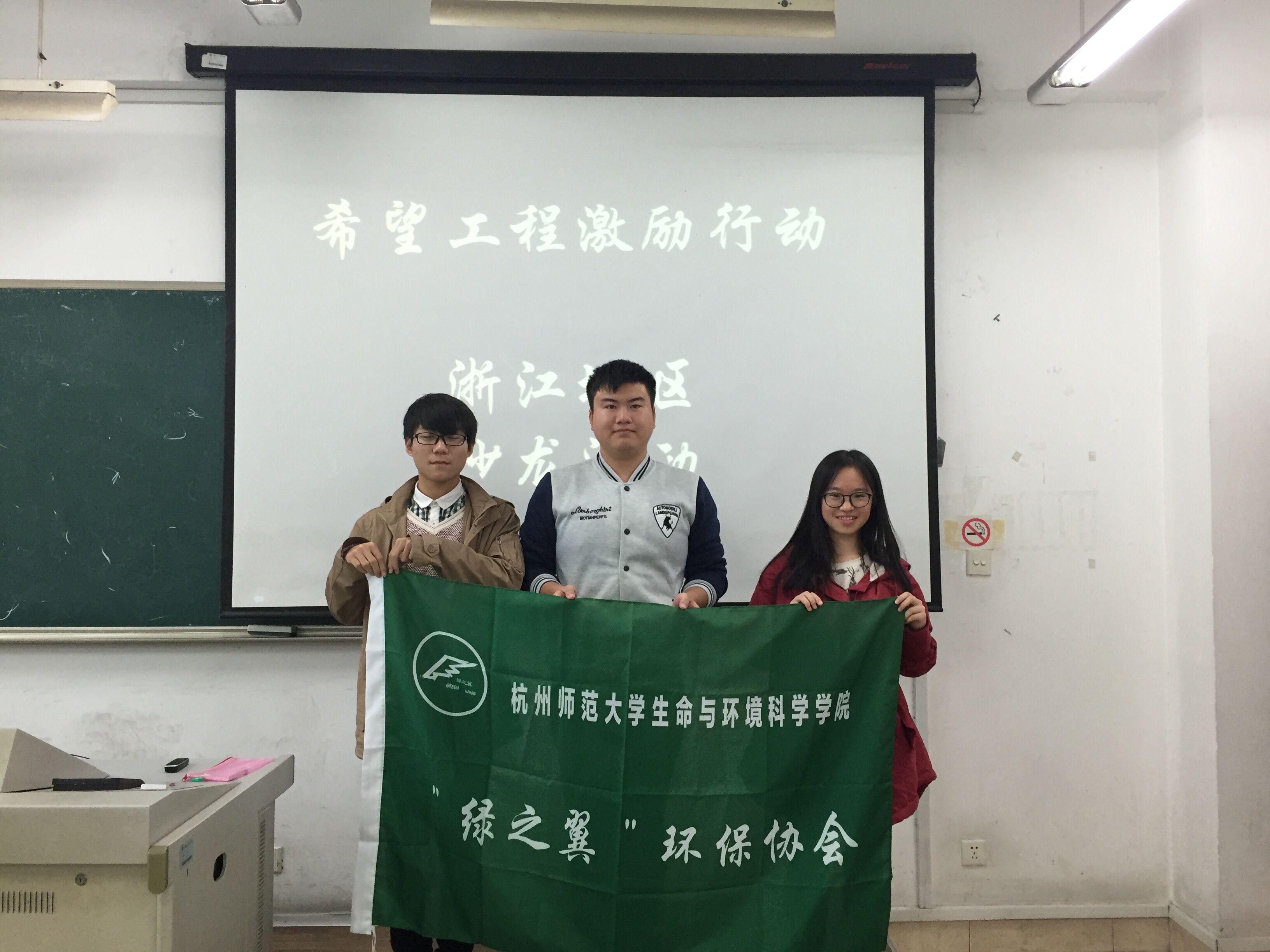 2015年11月21号下午,"绿之翼"环保协会三名成员参加了在浙江工业大学举行的2015希望工程激励行动分享交流会。出席此次交流会的项目组还有浙江大学心暖晨曦项目组、浙江工业大学灶画回忆项目组、浙江工业大学“急时雨”急救知识进社区项目组、浙江音乐91制片“音之愿”项目组和浙江中医药大学“iHuan”项目组。