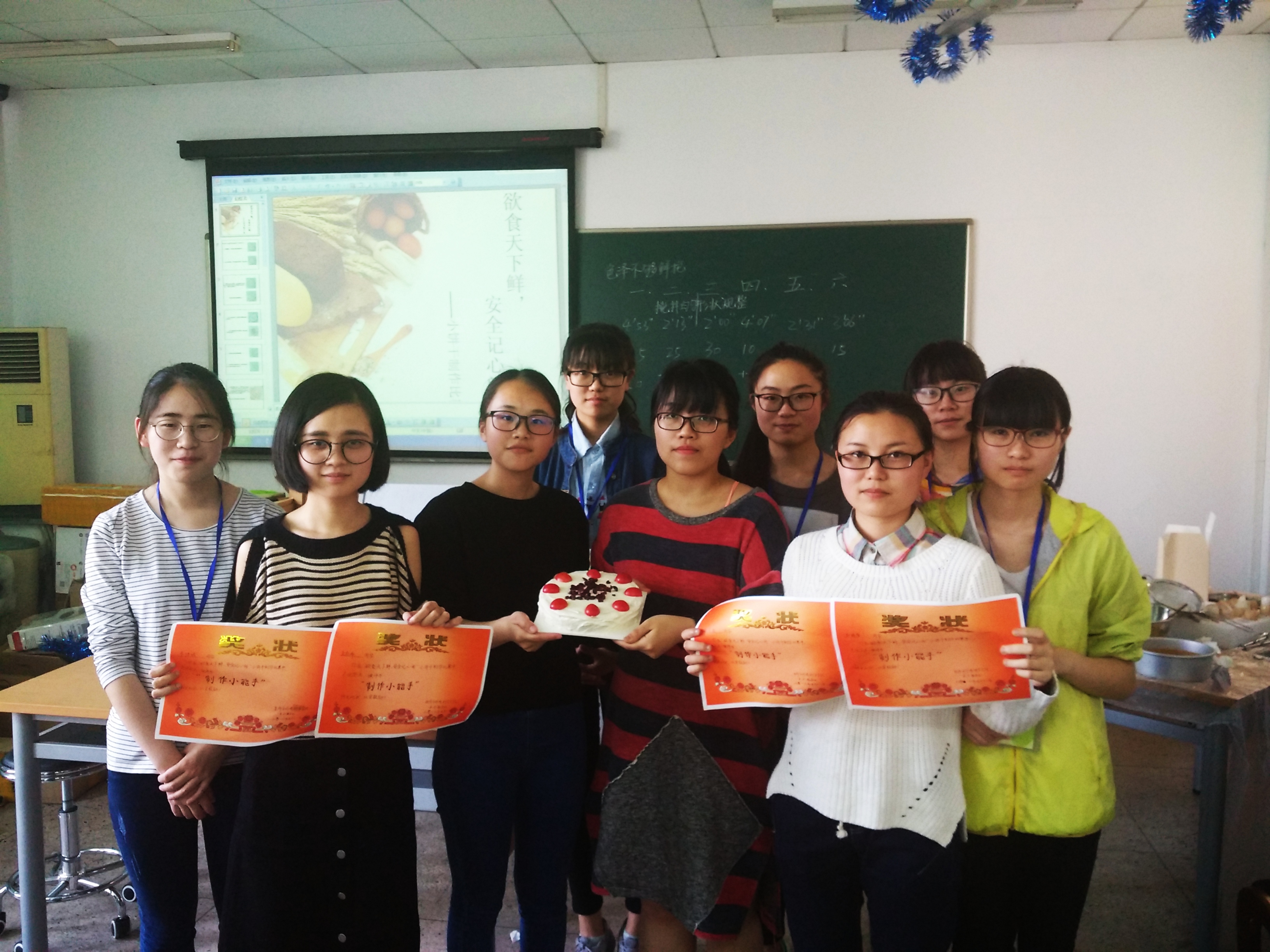 在同学们的欢声笑语中,很快饼干胚就进入了冰冻阶段,与此同时,讲解人人都关心的食品安全问题的小课堂也开始了,同学们认真聆听的同时,也收获了不少知识,了解了几个误区,这些知识也很快在接下来的游戏环节派上了用场:翻牌游戏中18种食品添加剂名称虽让同学们有些头大,但也让同学们对它们印象更加深刻;抢答问题时,最为手疾眼快的四名同学运用自己刚刚学到的知识为所在小组加上了宝贵的分数。这个环节过后,同学们的饼干也很快香气四溢地被推出了烤箱,在评委们的品尝评点中,在同学们的赞叹声中,人人都收获了欣喜与满足。在最后的评点环节中,第二组同学凭着她们饼干鲜艳的色泽,适中的口感与游戏环节中的优秀表现拔得头筹,获得了当天新鲜制作的蛋糕以及B.D.服务社颁发的奖状。