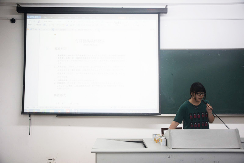 接着,由团委宣传部部长兼91制片主任王柯诺向大家介绍关于实践活动过程中的稿件要求。每个参与实践活动的队伍都需要写关于此次活动的稿件,稿件主要分为四个部分。第一部分是“最新报道”,即 800字以内的新闻稿,由小分队宣传联络员负责,采取一事一报的形式报导今天的活动,视日程安排而定,每支队伍每天1—2篇,每篇稿件需要2张及以上照片。第二部分是“实践日记”,即1000字以内的日记稿件,侧重每一个参与者在活动中的真情实感,内容是组员参加活动的内心感受,要求有文采,感情真挚,对活动、对社会实践有新的领悟,每支队伍每天2—5篇。第三部分是校外媒体对此次活动的相关报道。最后一个部分是“实践掠影”,即实践过程中的图片新闻,照片3-10张,每张照片文件必须命名。除此之外,王柯诺同学还为大家介绍了稿件格式以及投稿地址,在座的各代表们都听得格外认真,内心对此次实践的热情与渴望溢于言表。