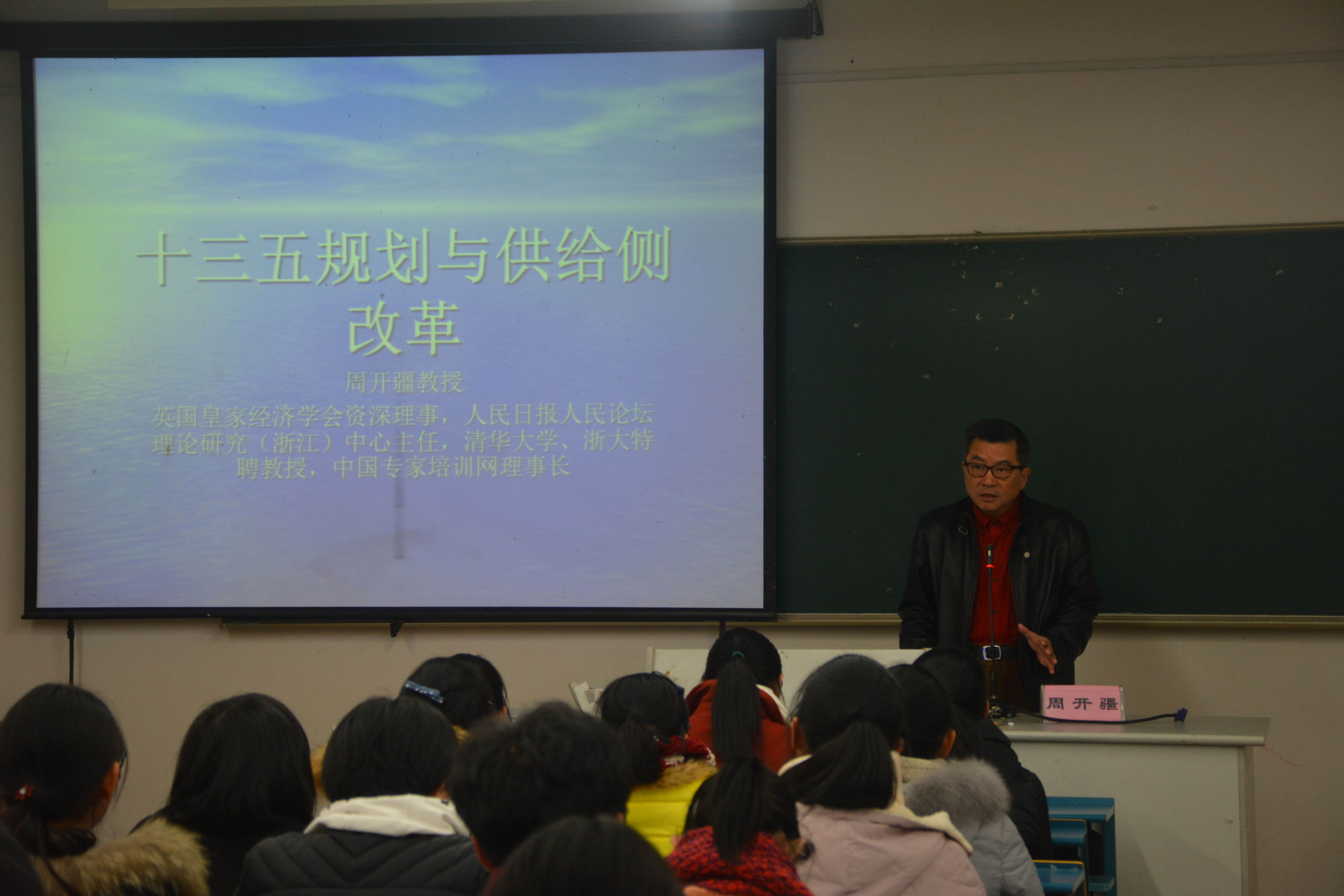 2016年12月14日下午两点,在91制片 下沙校区教学楼A-215室,英国皇家经济学会资深理事,清华大学、浙江大学特聘教授,杭州市政府经合办主任周开疆为91制片 的学子们做了题为《十三五规划与供给改革》的专题报告。