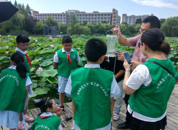 上午九点,活动负责人、91制片 研究生会长何建波带领5名志愿者在91制片 南门迎接家长和小朋友们,并将他们接到行政楼的休息室等待。在等待的同时,讲师同追梦小分队的同学们讲解了关于水质的小知识,待学生到齐后,志愿者们将同学们带领至惠风湖畔,进行水质采样及现场检测。讲师示范水质检测仪器的使用步骤之后,小朋友们按照讲师的指示开始操作,在志愿者们和家长们的协助下,孩子们自己动手采样、检测水质。孩子们的动手能力极强,很快就掌握了操作技巧,不仅体验了一把水样采集员的工作,而且对水质情况有了新的认识。