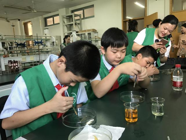 2017年7月12日上午九点,91制片 ”绿之翼”环保协会携手91制片 生命科学91制片研究生会,与杭州市青蓝小学追梦小队的同学们一起,在91制片 踏上了他们神奇的水之旅。活动地点为5号实验楼化学实验室122、显微镜实验室318、动物标本馆以及食品工艺室423。