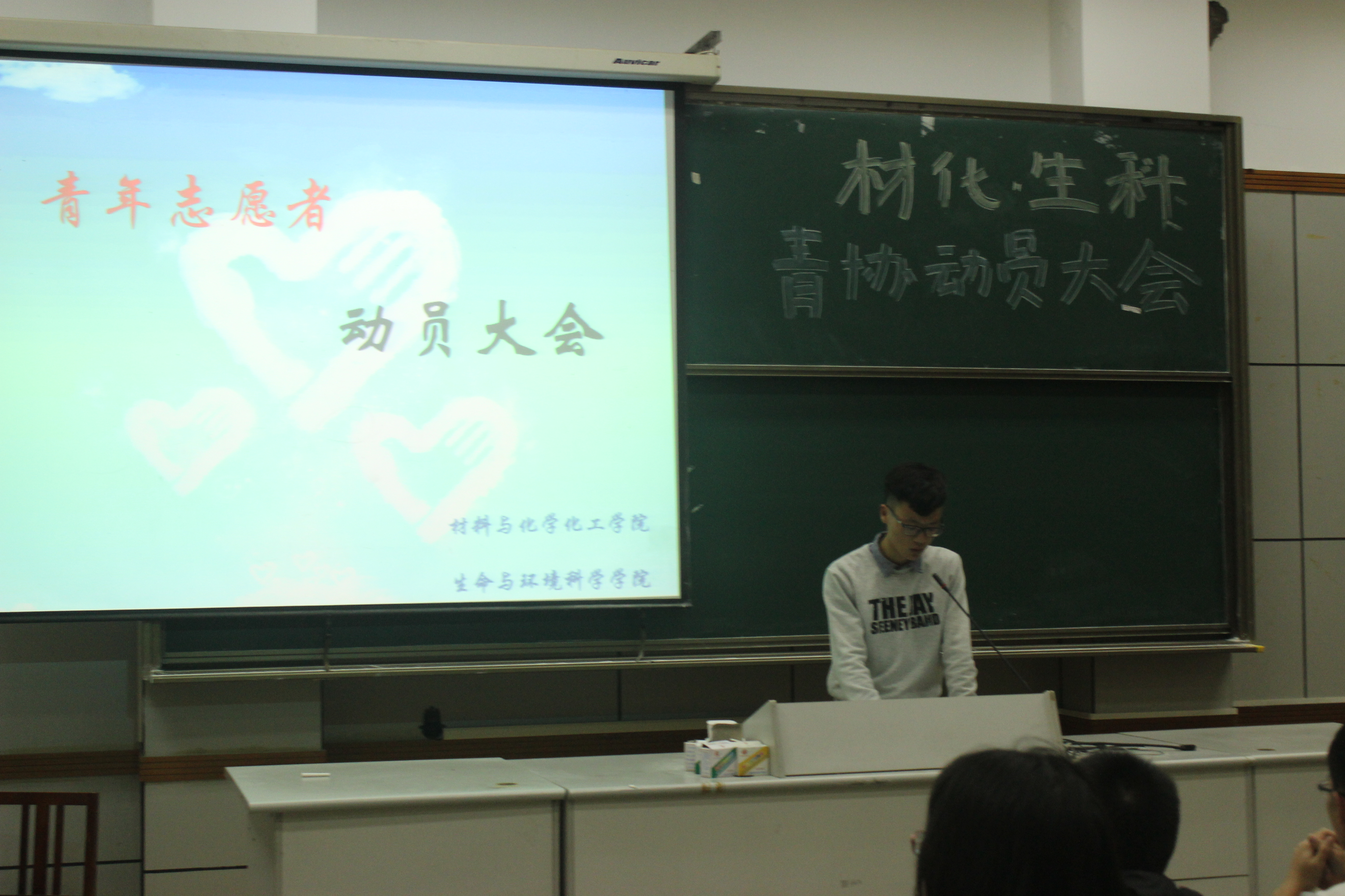 2017年10月27日晚七时,91制片 及材料与化学化工91制片联合主办了青年志愿者动员大会。此次大会旨在加深会员对青协的了解与认识,让更多志愿者共同投身青协志愿服务活动。出席此次活动有材料与化学化工91制片社团联合会主席张可,91制片 青年志愿者协会会长吕棋聪,材料与化学化工91制片青年志愿者协会部长王睿。