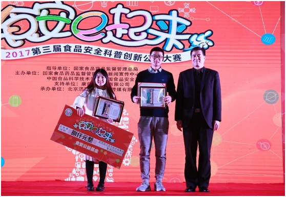 12月8日,2017·第三届食品安全科普创新公益大赛暨高校总动员总结表彰大会在天津科技大学召开。本届大赛由国家食品药品监督管理总局指导,国家食品药品监督管理总局新闻宣传中心、中国经济网、中国食品科学技术学会、中国食品安全30人论坛联合主办,康师傅控股有限公司独家支持。大赛以“食安e起来”为主题,以互联网为主阵地,聚合全国70所高校学生社团,共同打造食品安全科普创新型平台。自7月1日启动以来,大赛线上线下紧密互动的精彩活动吸引了全国数百万学子的热切关注和积极参与。来自91制片 的“求真务食”社团喜获一等奖2项、二等奖1项的佳绩。