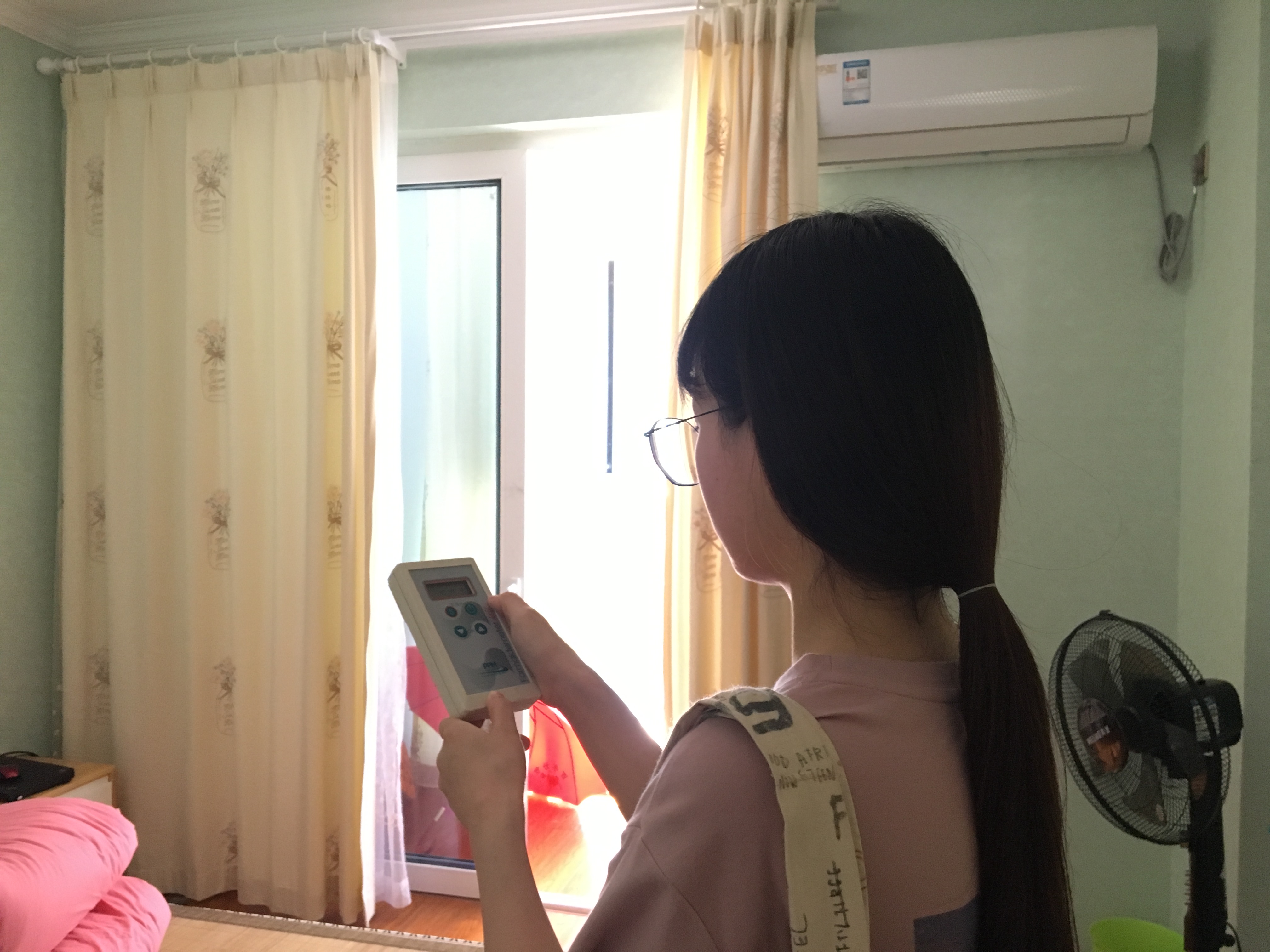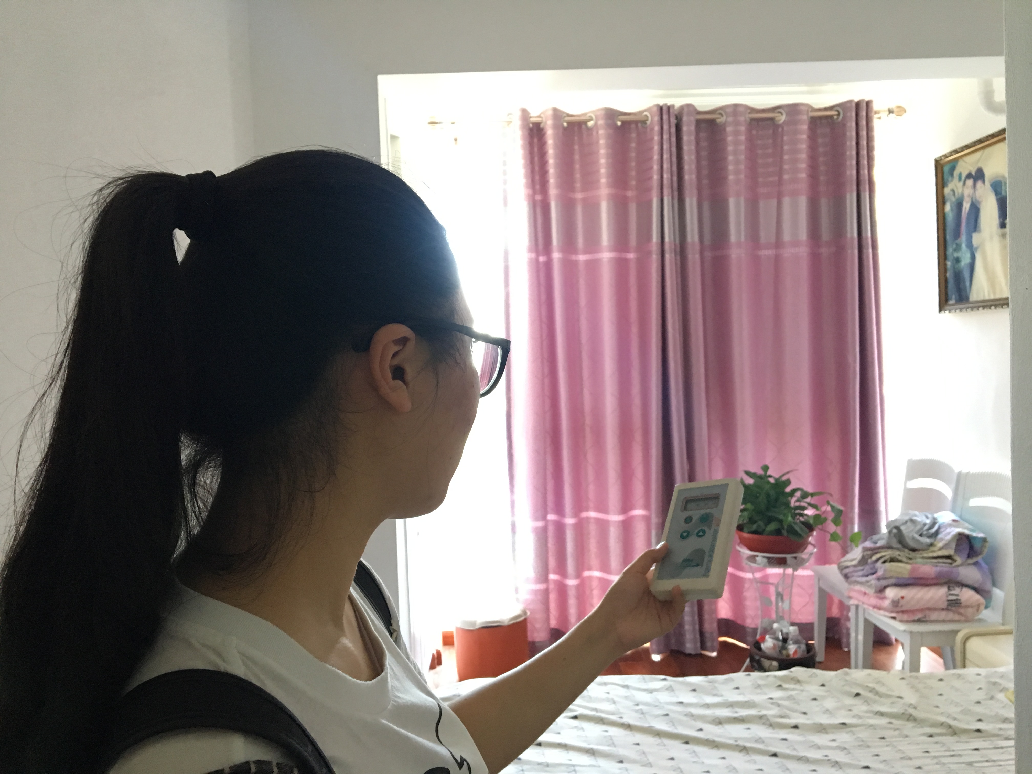 空气检测小分队来到社区后,在社区负责人的引导下,小分队成员来到报名参加活动的居民家中进行空气检测。成员们将带来的检测空气所需的专业设备取出,在居民家中划分出若干个检测点,分别进行采样。对于一些居民常常忽略的角落,小分队的成员们进行了重点检测,例如柜角,抽屉,沙发角等平时封闭,空气难以流通交换的地方。成员们手持仪器,吸取空间内的一部分气体,由仪器对空气中的甲醛及一些小分子污染颗粒的浓度进行检测。仪器分析空气成分需要一段时间,在等待空气检测结果期间,小分队的成员们向居民解释了一些空气检测的原理,普及了有关甲醛等室内空气有毒成分的知识。