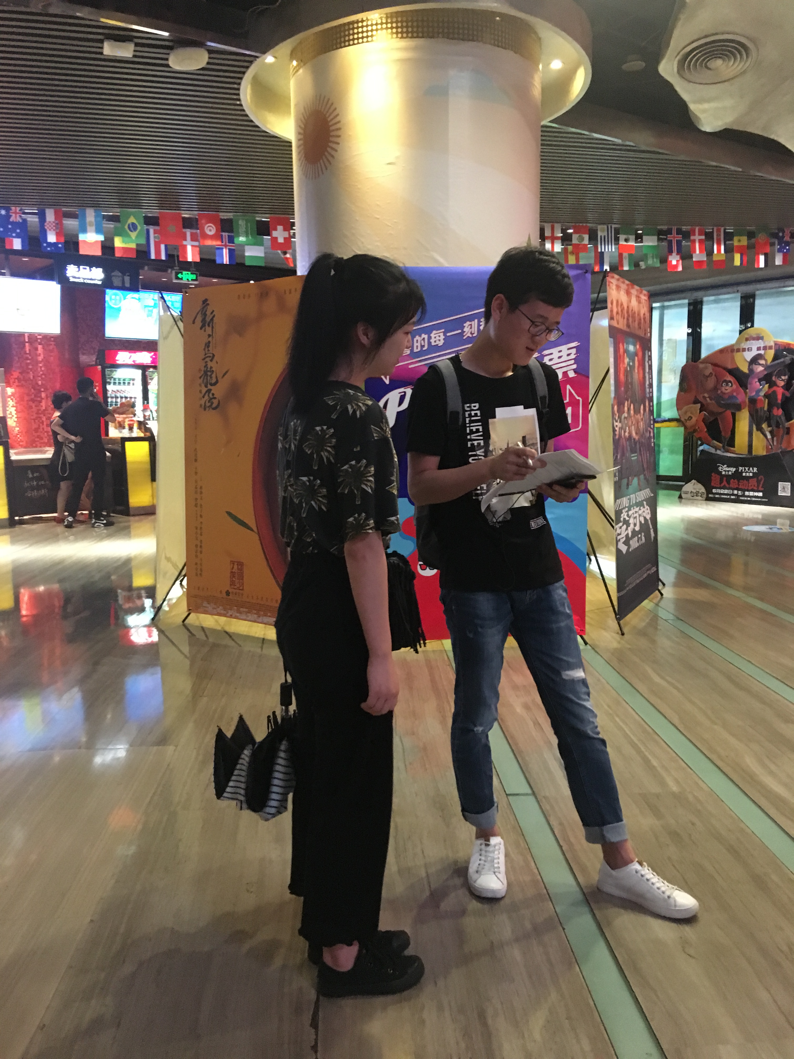 队员们在地铁站集合,沿路发放问卷。两人一队,一人发放调查问卷时另一人负责拍摄记录。在制作调查问卷时,第一题就是受访对象的年龄段,这能更好地体现出调查数据的多样性。调查过程并不是一帆风顺的,经常会有碰一鼻子灰的时候。有时候匆忙赶路的人们并不愿意停下来慢慢思考填写两页A4纸的题目,但是因为队员们的热情与努力,以及分工合作的高效率,小分队还是在短时间内完成了手头的问卷调查任务。