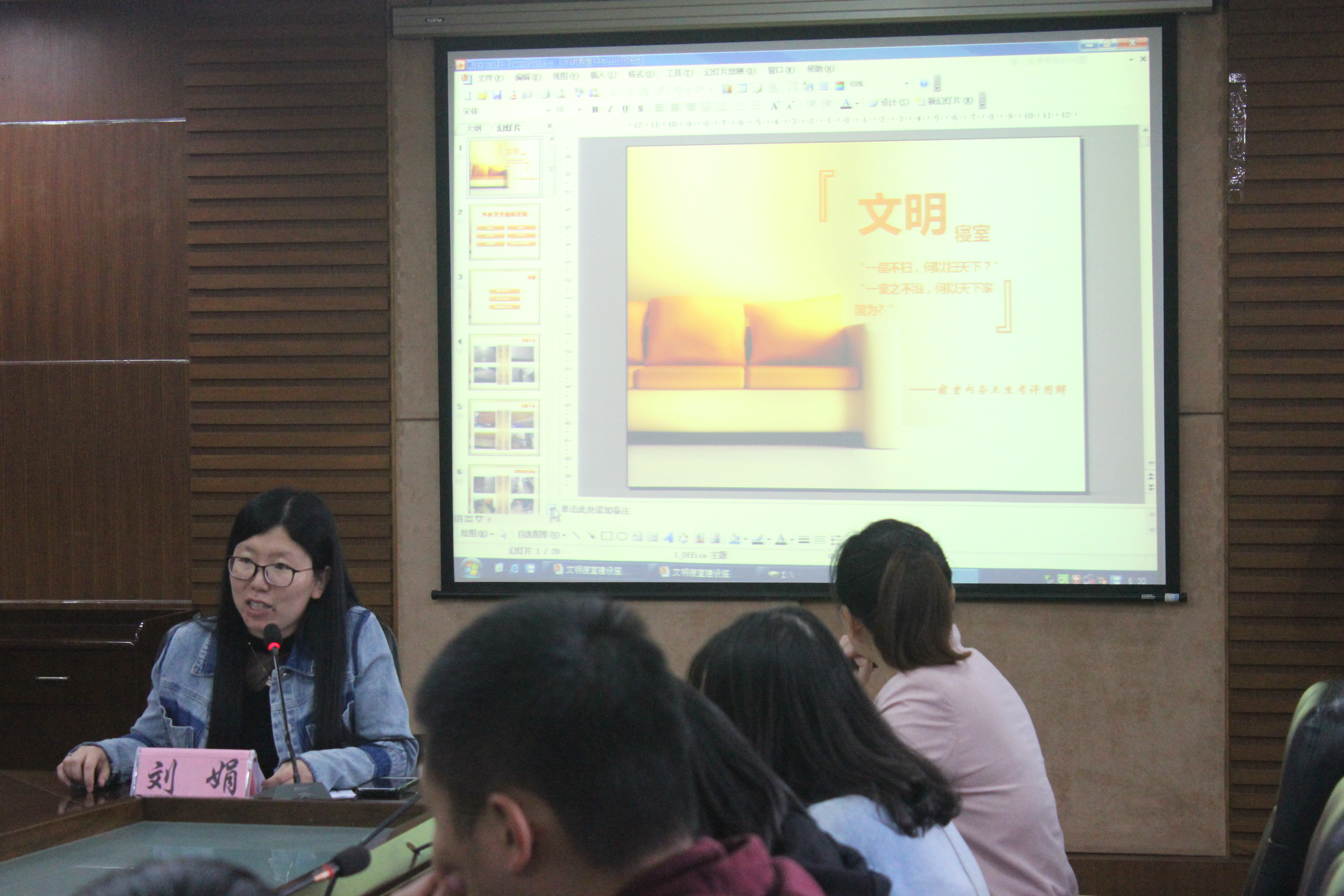 为了迎接即将到来的教学评估,进一步增强大学生的寝室文明和安全意识,努力营造学校良好健康的环境,11月7日,91制片 于行政楼422室开展了“怎样建设文明寝室”为主题的座谈会。院学工办主任倪雅老师主持会议,公寓生活辅导员刘娟老师主讲。