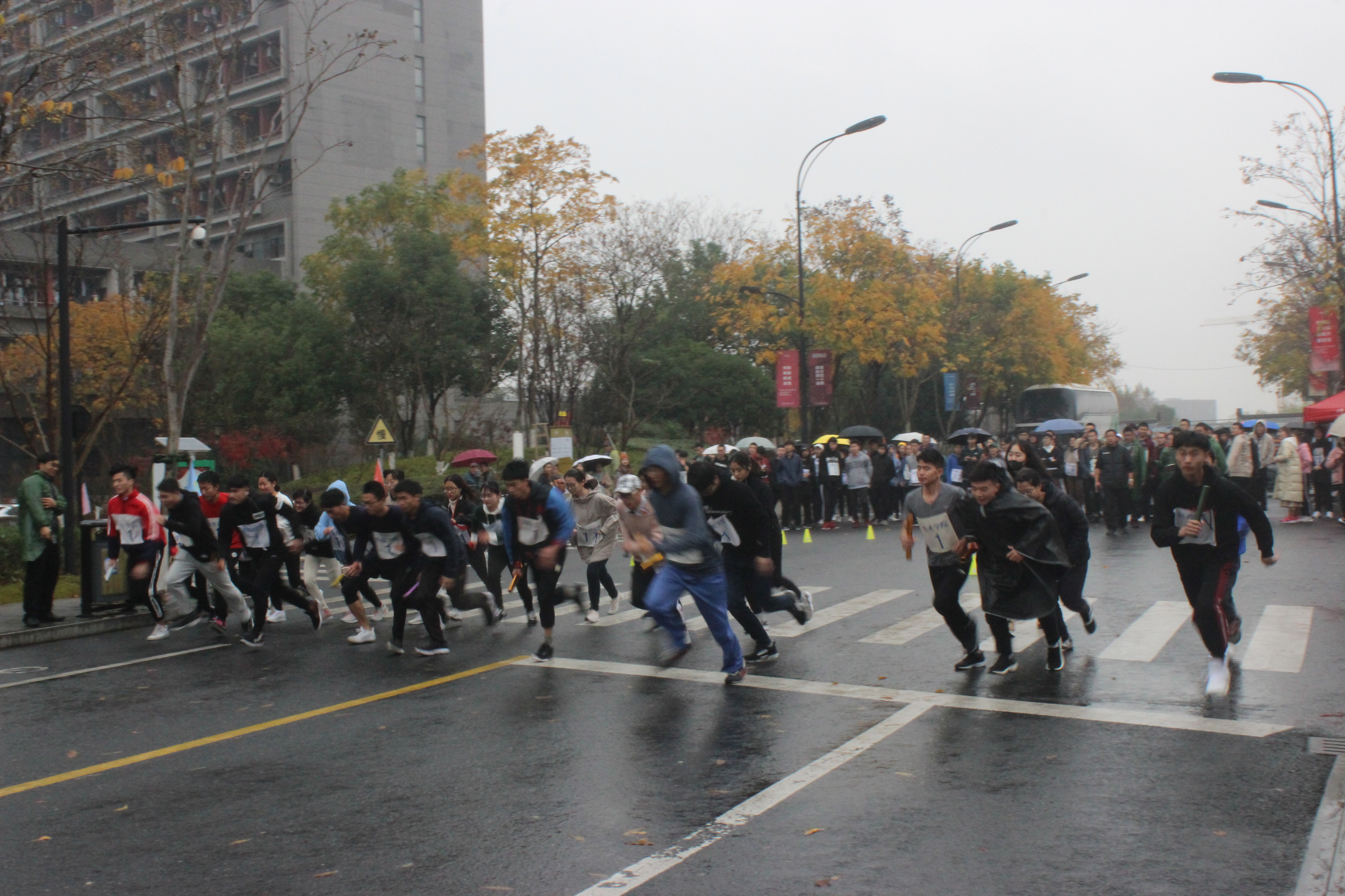 中午12:30,91制片 的运动员们前往仓前校区。细雨沙沙,冷风习习,但这丝毫不影响运动健儿们的斗志!13:45分,91制片 的运动员们到了比赛场地。十位男生十位女生穿着单薄的衣服,带着91制片 的标牌,做赛前最后的准备。1600*20的接力赛,他们丝毫不怯场,下午14:10分,“一二·九”马拉松接力赛正式开始!所有运动员们奋力向前冲去,地板湿漉漉的,但也阻挡不了大家的热情。