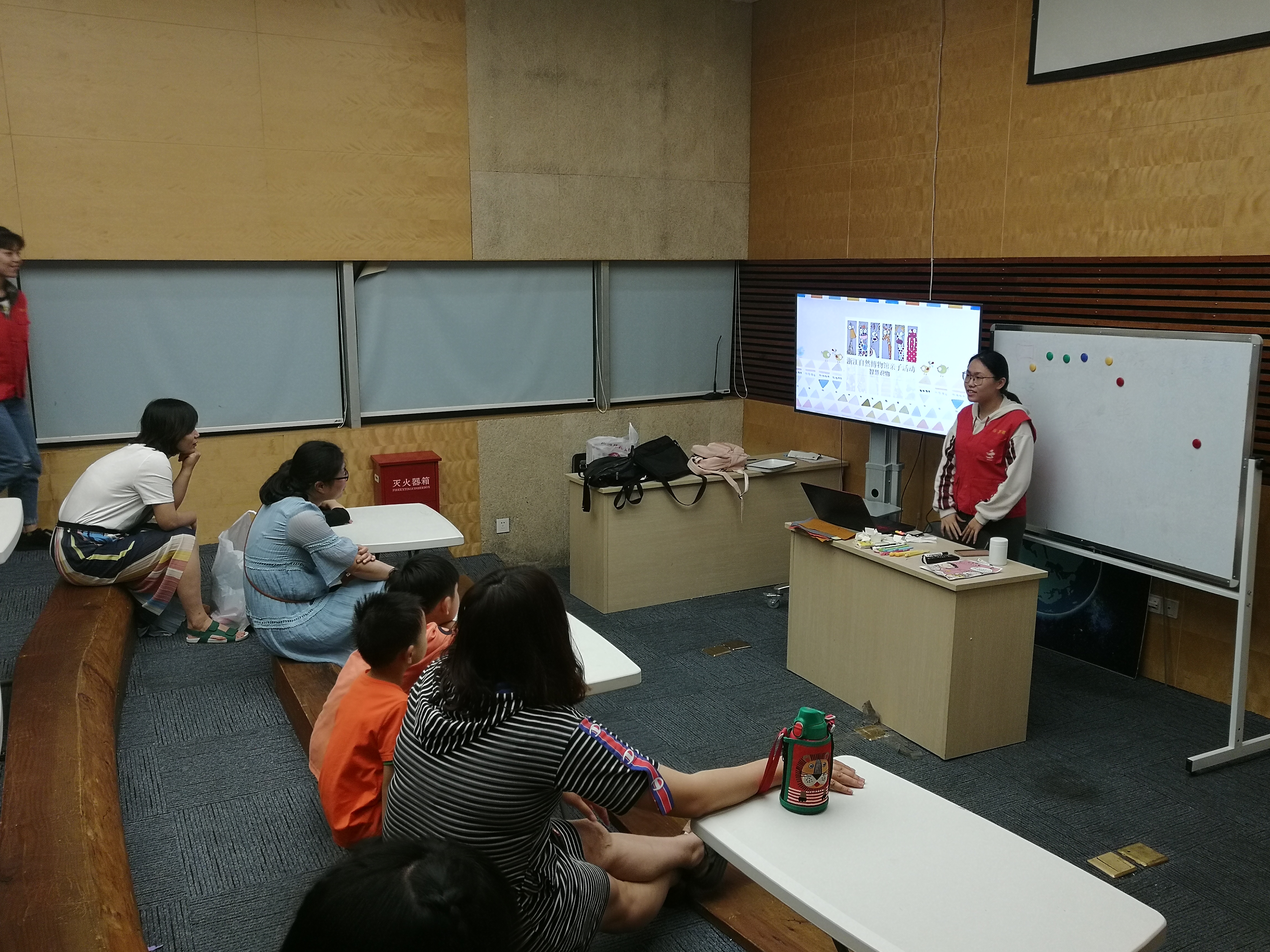 科普视频作为开场部分结束后,B.D.服务社开始了他们的主要活动部分——课堂讲授和“你画我猜”。志愿者讲解时,融入了许多互动环节,让小朋友通过猜小动物这一互动充分参与到活动当中,一张张小动物的图片色彩鲜明,吸引了小朋友的注意力,让他们竞相回答问题,有些小朋友没举手就已经脱口而出,志愿者在小朋友回答问题后都会用赞美的言语来鼓励称赞小朋友同时送出小礼品,利用肢体语言让小朋友感受到他人对自己的认可,这也让他们在学习过程中更加主动。讲解结束后到了小游戏环节,先邀请家长们来抽取小纸条表演指定的小动物,由家长们排成一排,依次向自己的小盆友比划,志愿者们选择的词条都十分有代表性,家长在比划时也很用心,有个小朋友在猜的时候一直偏离答案轨道,引得家长哈哈大笑,让科普教室里回绕着欢快的笑声。这场互动的环节,家长和小朋友都很好地参与了进来,促进了家长和小朋友的感情,达到了亲子活动的目的。
