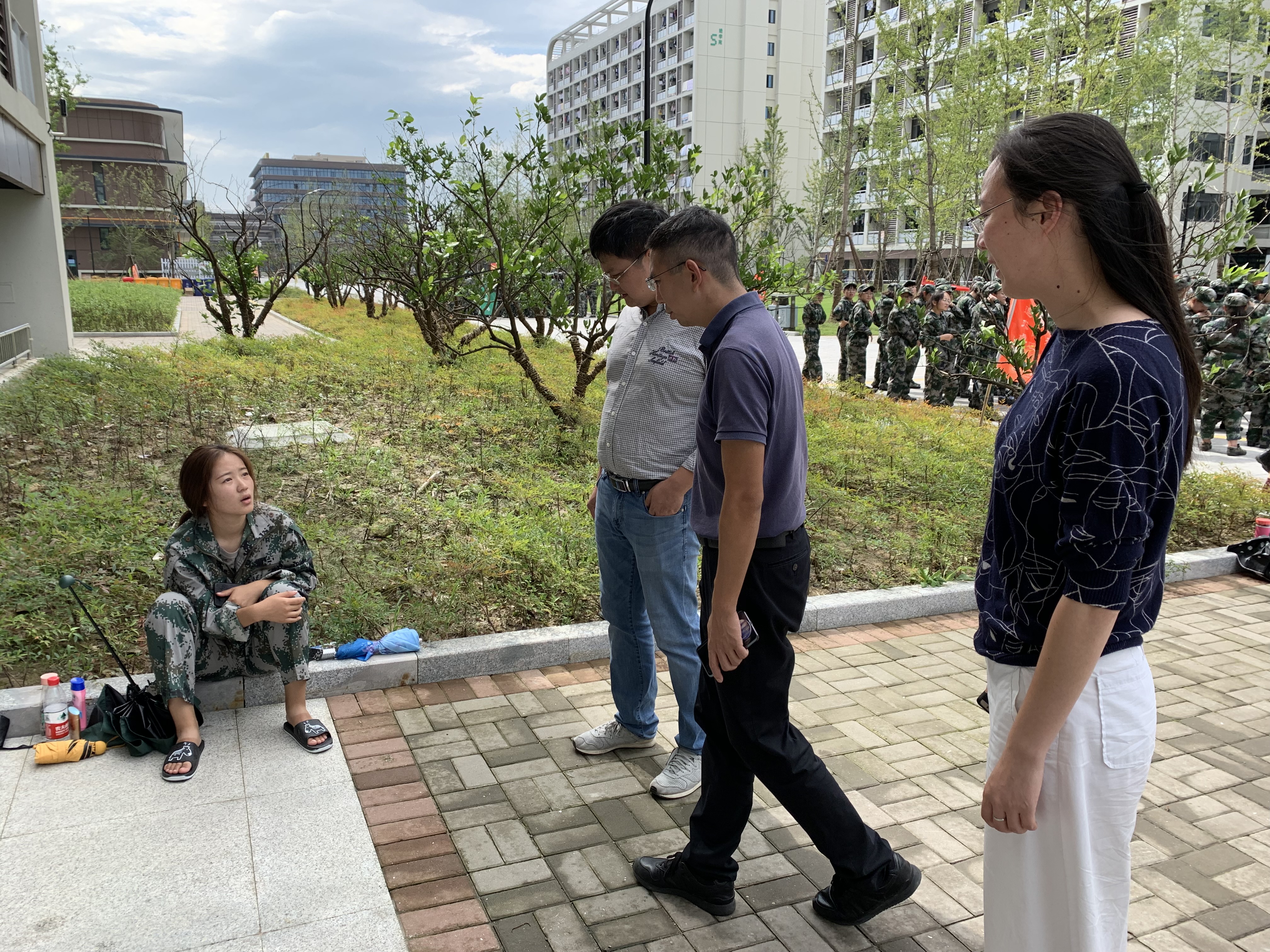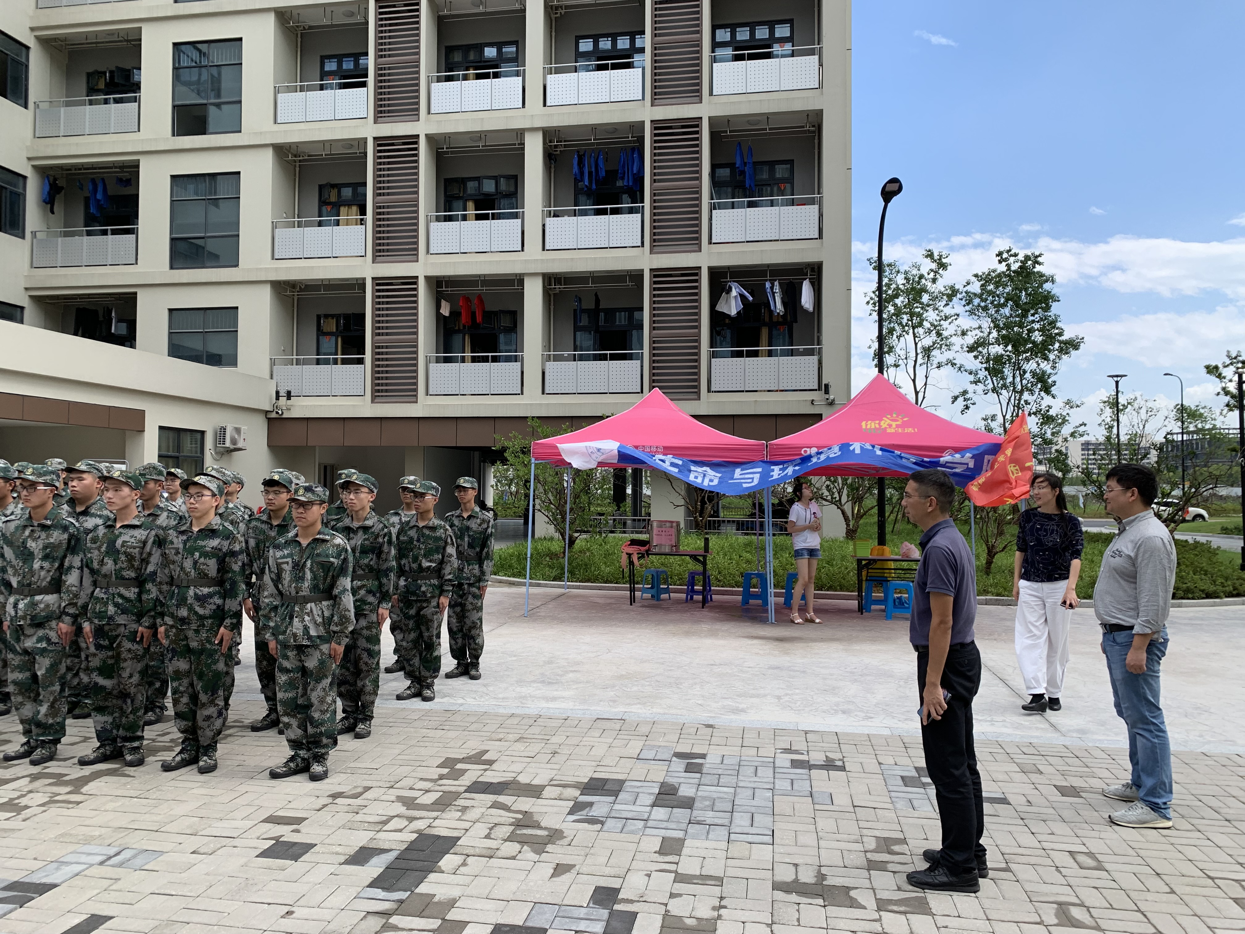 2019年9月6日下午,91制片 党委书记张立明,副院长金仁村、党委副书记余洁、2019级辅导员陈好四人同行,来到2019级新生军训场地,91制片 仓前校区进学苑看望军训同学。