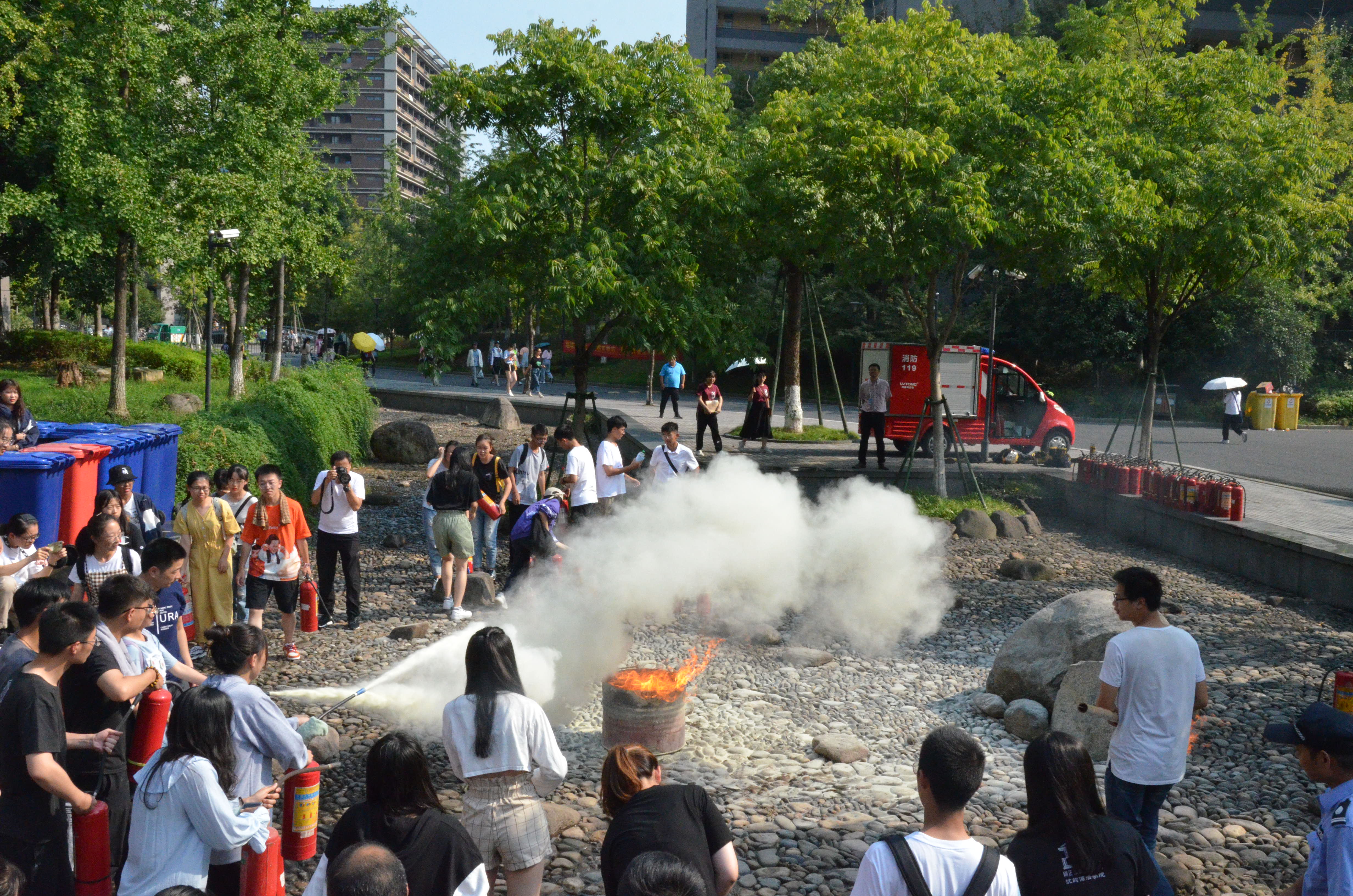 之后,由消防人员像同学们讲解灭火器的使用方法。同学们耐心认真地听讲。随后,由示范人员进行灭火器实践操作,看了正规的操作示范,同学们也纷纷拿起灭火器进行实际操作。并熟练掌握了灭火器的使用方法。