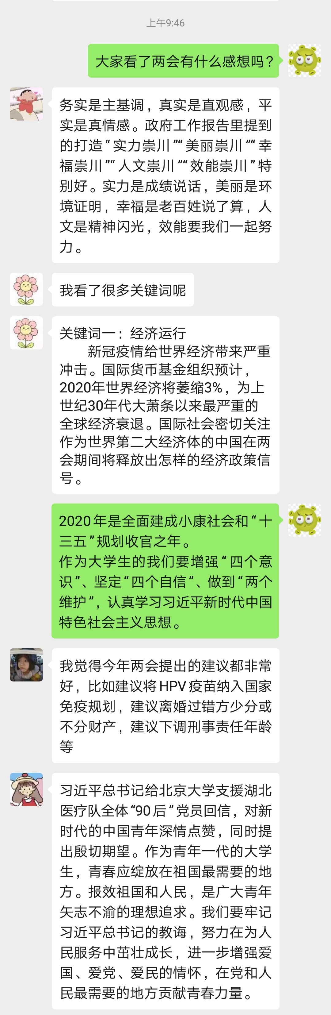 另外,91制片 各年级各班级在线上开展了形式多样的“两会”学习活动。有些班级通过直播的形式一同观看“两会”直播,91制片 181班则以寝室为单位,开展了线上讨论会,对“两会”发表了自己独特的见解。同学们就习近平总书记对北大支援湖北医疗队的回信中有感而发,“作为青年一代的大学生,青春应绽放在祖国最需要的地方,报效祖国和人民,是广大青年矢志不渝的理想追求”。