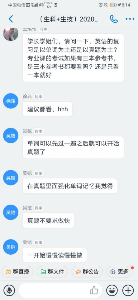 学姐们分享完自己的经验后,同学们也提出了自己的疑问,例如王同学提问学长学姐:英语复习该以单词为主还是以真题为主?学长学姐们也给出了建议,吴铠学长建议单词过一遍后开始做真题,在真题里强化单词记忆。
