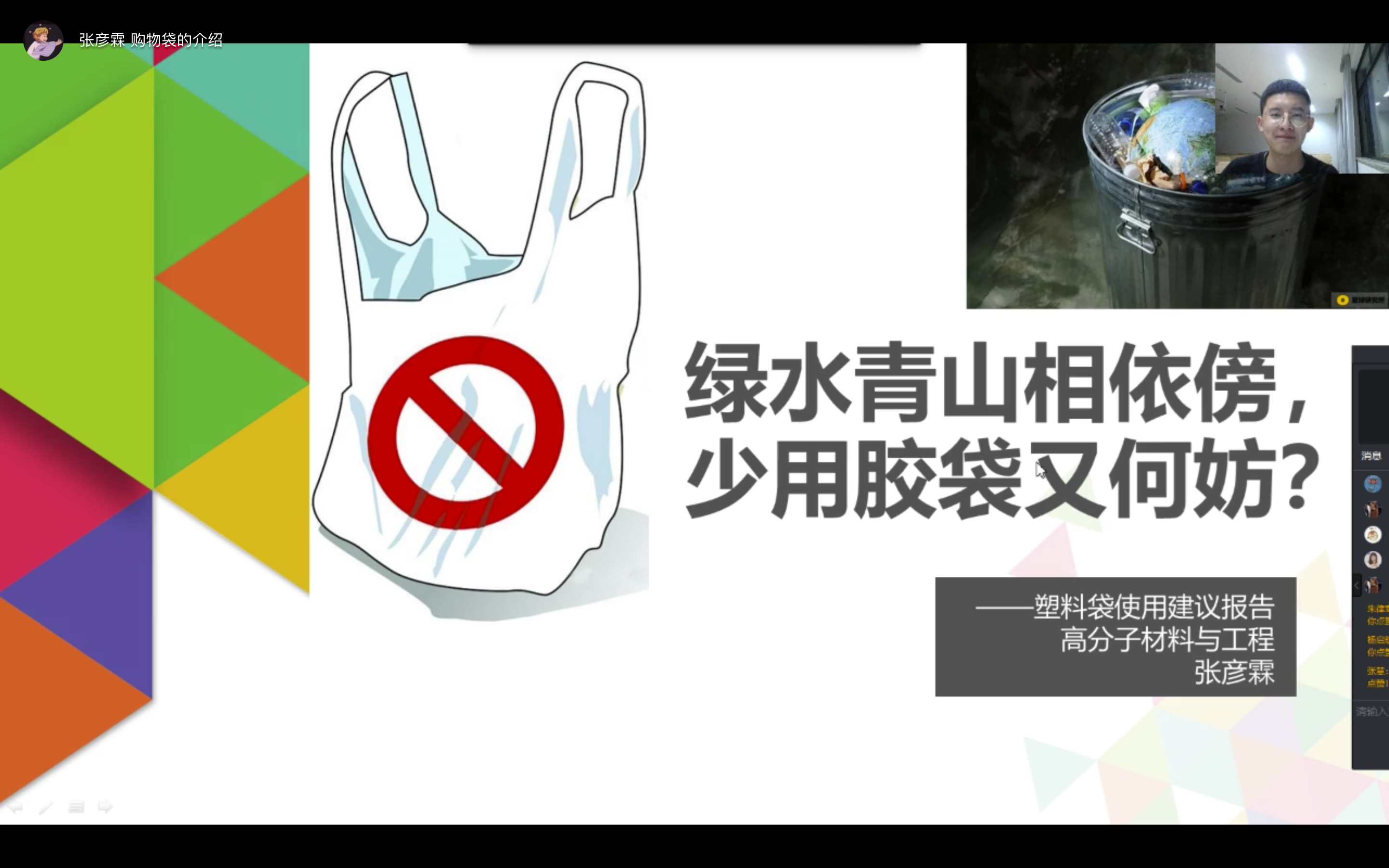 最后,组织人员还邀请了材料与化学化工91制片高分子化学专业的张彦霖学长,学长本次演讲的主题是“绿水青山相依傍,少用胶袋又何妨?”学长就高分子材料中塑料袋的垃圾分类进行了更为深入、细致、专业的讲解,共分为四个部分:限塑令解读、可降解塑料介绍、三大购物袋对比、具体环保建议。当拒绝塑料袋成为一种习惯,绿水青山也就离我们不远了。整场活动同学们都积极踊跃地回答问题,和主持人有很好的互动。