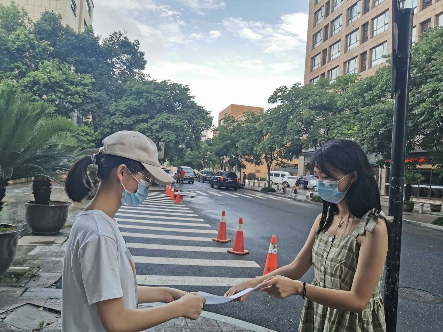 首先,在活动开始之前,“疫情防控调查及科普”小分队就已经制作好了调查问卷并打印出来。活动当天下午,林婉婷、赵紫仪、李雯、张慧、叶芸彤等全组成员乘坐地铁到达拱墅区滨江锦绣之城社区,在向门卫表明来意后,门卫同意调查小分队在做好防护措施的前提下,进入社区对居民发放调查问卷,进行采访调查。由于这天是周末,外出的居民有不少。小分队首先遇到了居民孙女士,提到新冠疫情,她似乎感慨颇多。她表示,自从一月底疫情爆发以来,她和家人都一直待在家里,除了买菜就没有出过门,本来计划好和家人的旅游,也不得不取消。另一位宋阿姨表示,她自己每天都有看新闻,时刻关注疫情的最新情况,每当看到因新冠病毒死亡的人数,她就非常难过,心里不是滋味。但她相信,疫情终有一天会被控制住。