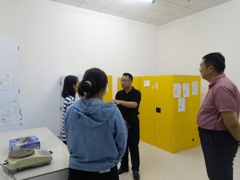 首先,赵飞处长检查91制片的危化品室,指出安全工作重于泰山。对危化品的管理要严格按照学校危险化学品的规范管理要求,尽可能减少91制片危化品室易制爆化学品的存储量,营造安全良好的教学、科研环境。