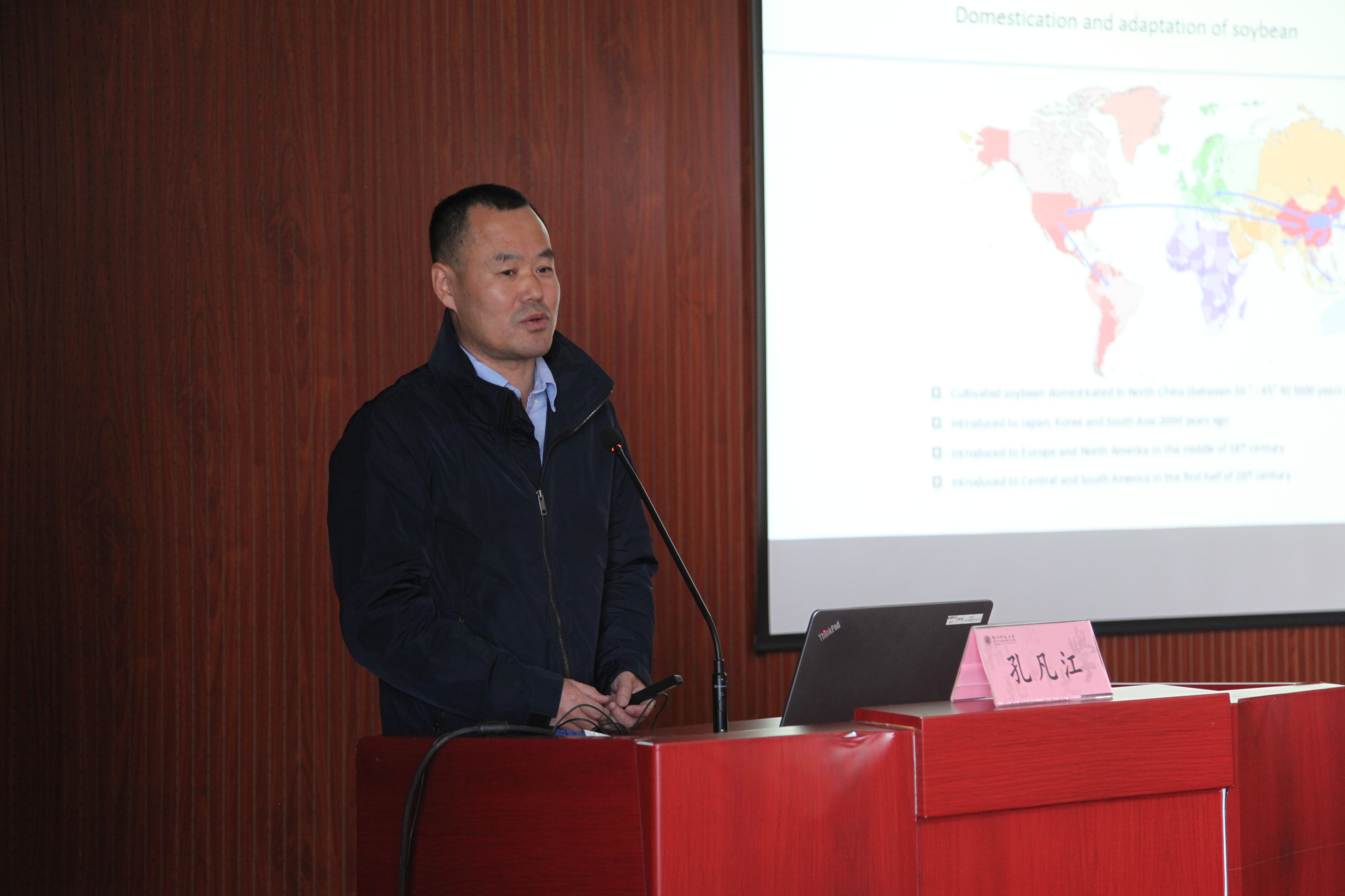 国家杰出青年基金获得者、广东省植物适应性与分子设计重点实验室副主任、广州大学孔凡江教授做了《控制大豆光周期适应性基因的变异与选择》的报告,他讲述了大豆高、低纬度生态适应性的分子机制,揭示了大豆光周期敏感性的关键元件,首次证明光周期是作物驯化的核心性状。此外,孔老师还分享了自己做研究及投稿的科研故事,引发大家思考。