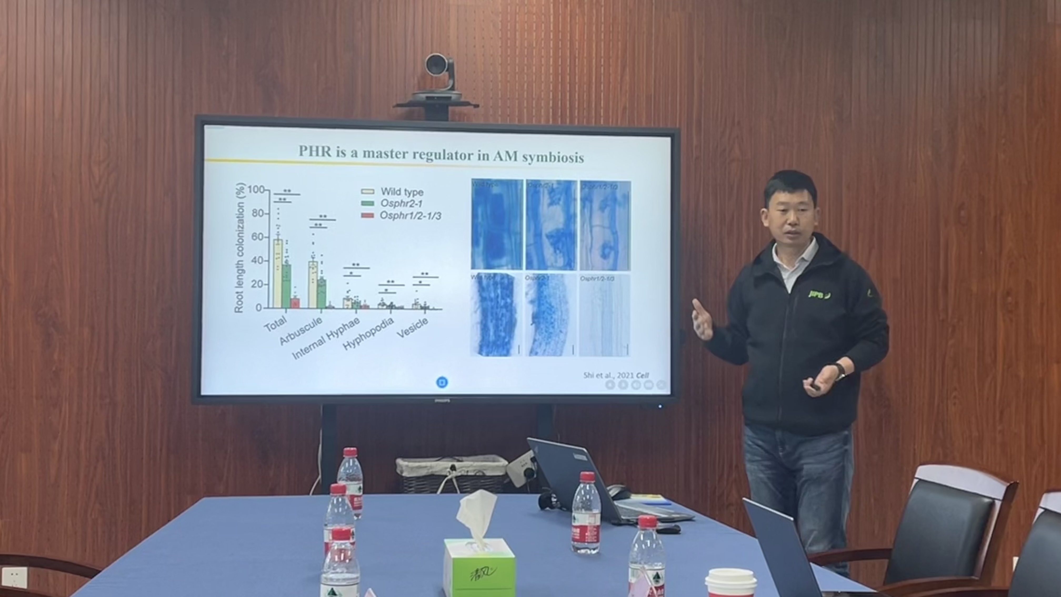 最后,王二涛研究员做了题为《植物-微生物共生的分子机制》的报告。他首先介绍了其颠覆教科书的新发现——脂肪酸是宿主植物提供给丛枝菌根共生的主要碳源,接着介绍了PHRs在调控水稻丛枝菌根共生信号中的核心功能,并进一步讲述SPX-PHR核心模块在水稻-丛枝杆菌共生“自我调节”中的作用机理。此外,他还详细讲解了植物如何区分共生信号与免疫信号的分子机制、重塑信号识别和豆科植物根瘤结构建造等方面的重要研究成果。