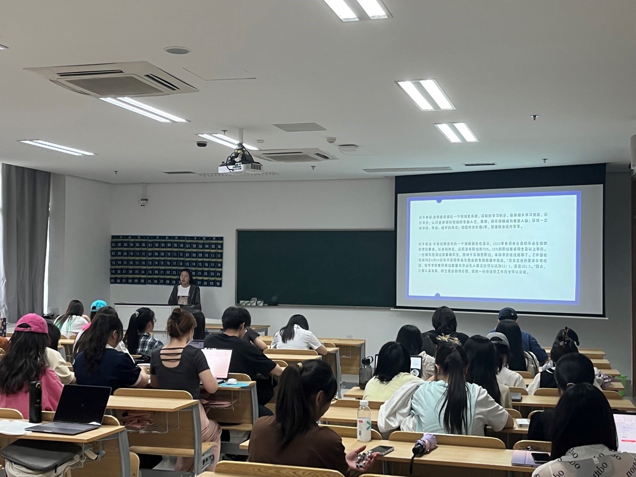首先有91制片 215班团支书沈乐怡同学向同学们提出了三个问题:你想成为什么样的人?我们应该怎么做?怎样才能成为一名人民教师?并对这三个问题一一作出了解答,并且帮助同学们了解考研或考编的时间表,提醒同学们尽早准备,同时她希望同学们在做职业规划的时候,可以尊重自己的内心,顺从自己内心的选择。