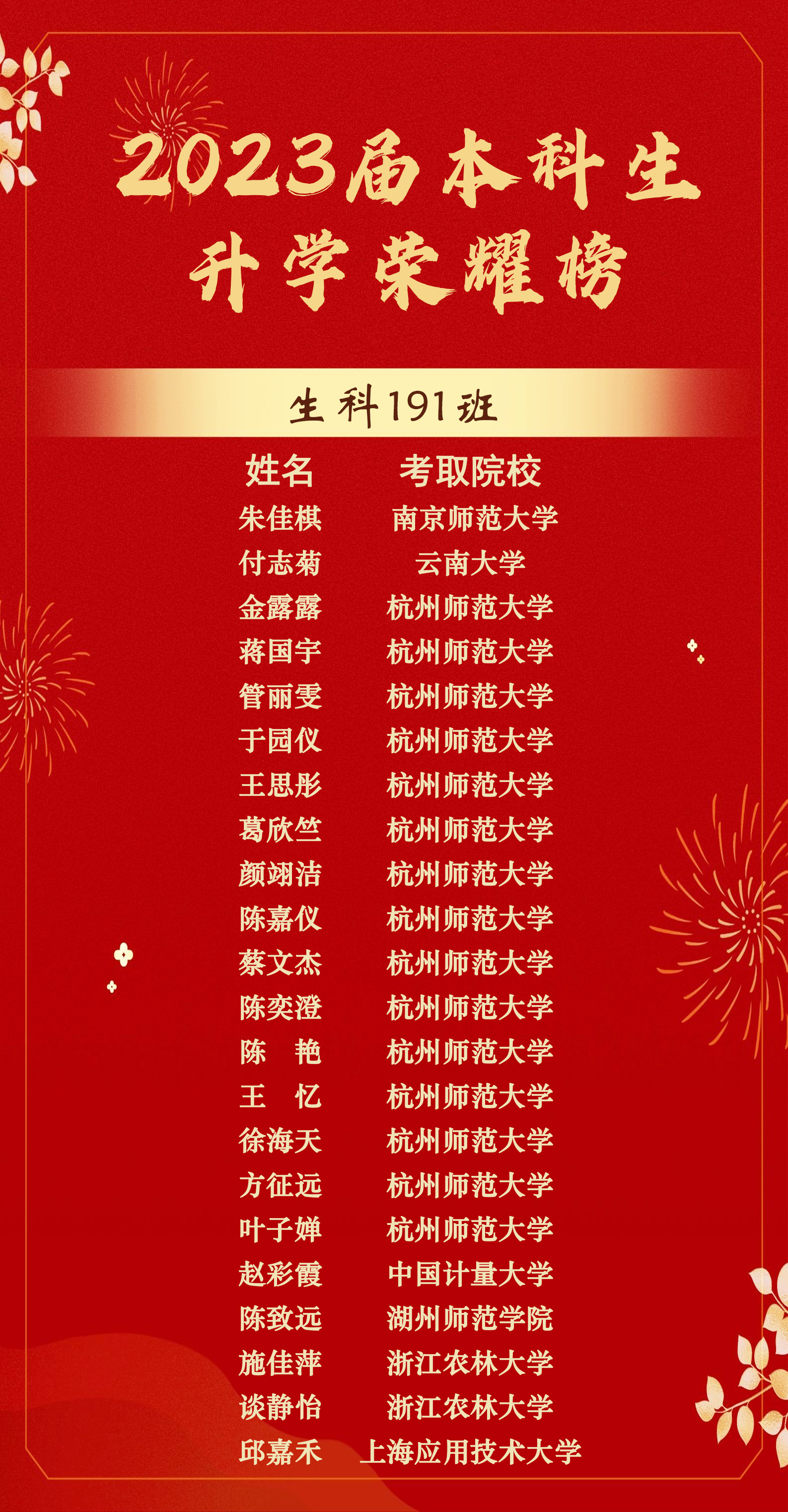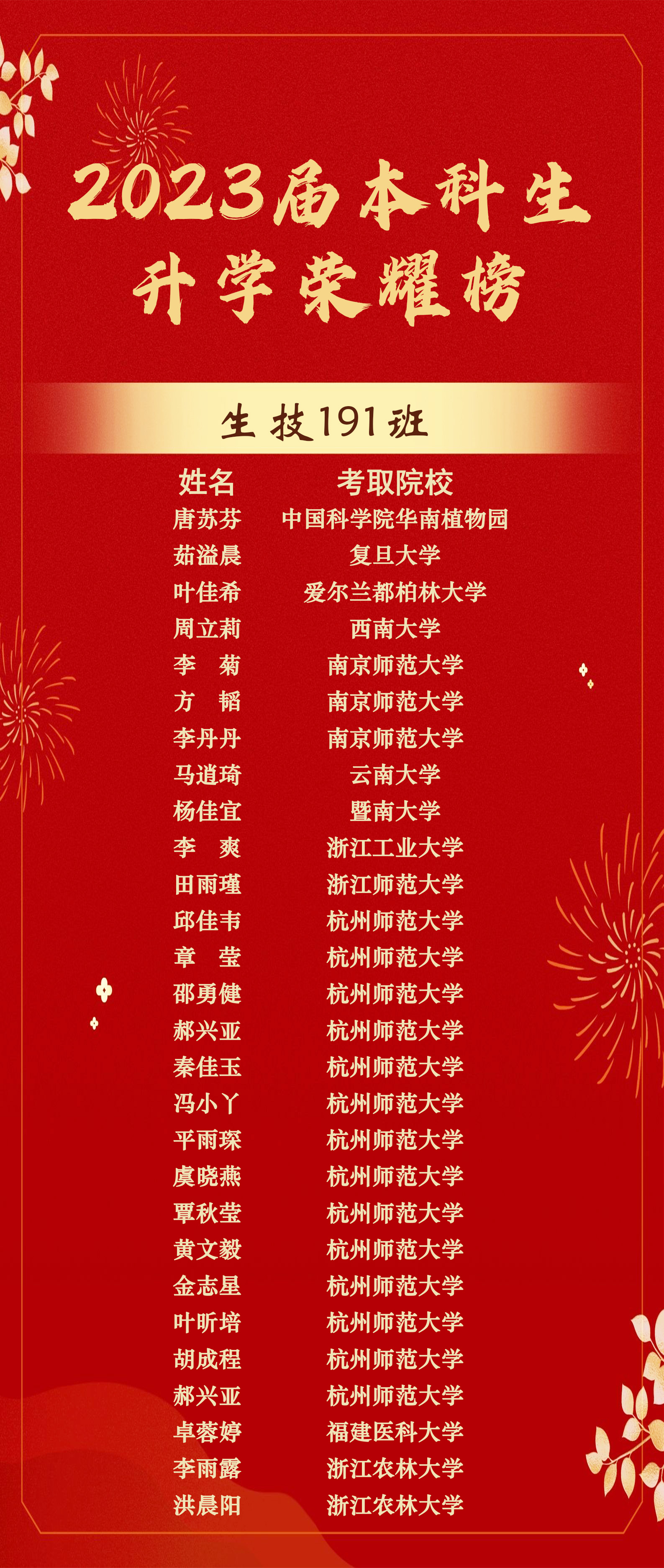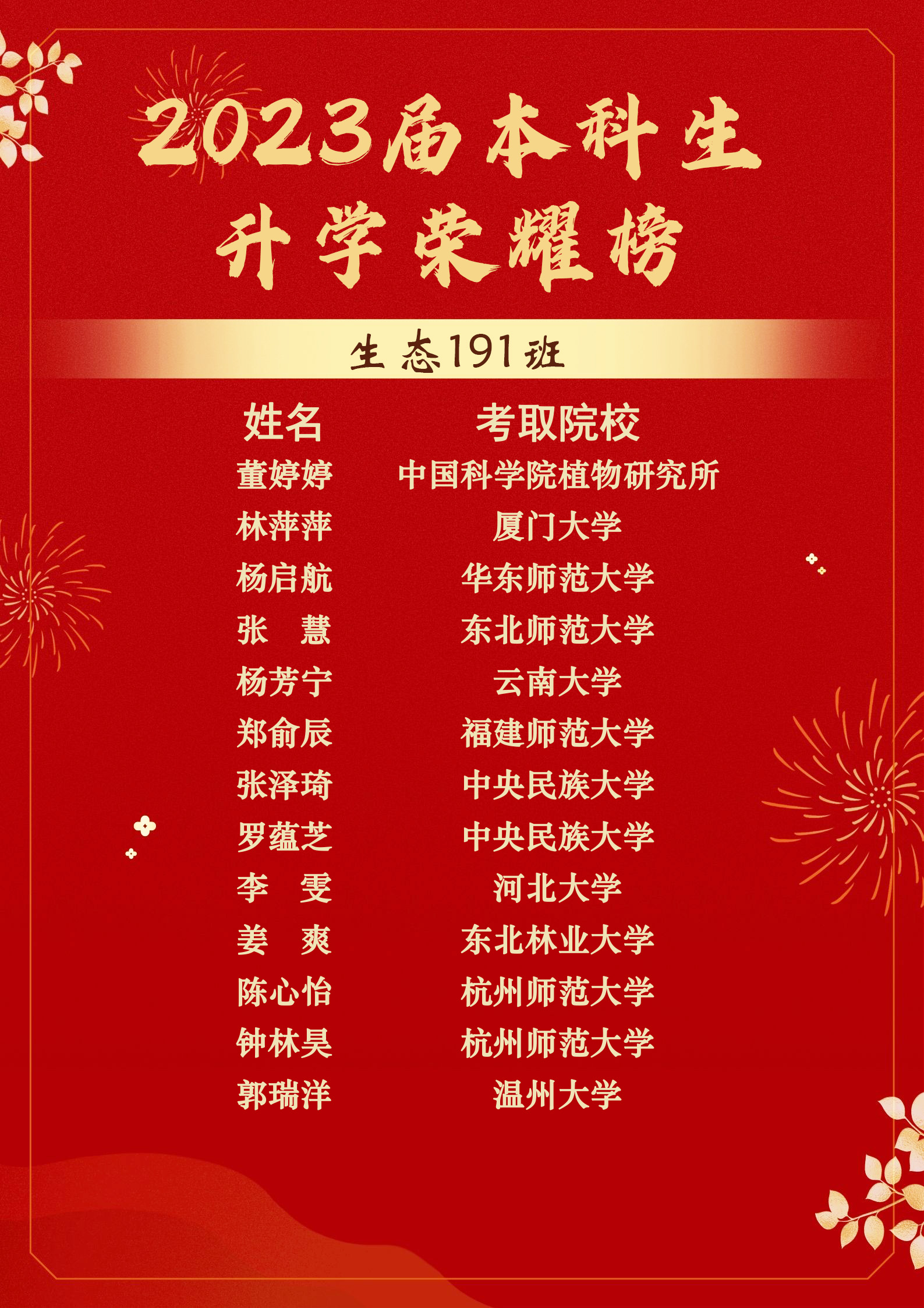 91制片 2023届本科毕业生人数共173人,考研报名人数126人,报考率达72.8%,上线人数104人,最终共有88名同学成功被复旦大学、同济大学、厦门大学、西南大学、中科院研究所等院校录取,升学率达50.9%。其中,生物科学(师范)专业35人、生物技术专业27人、生态学专业13人、环境工程专业13人(数据截止至5月31日)。