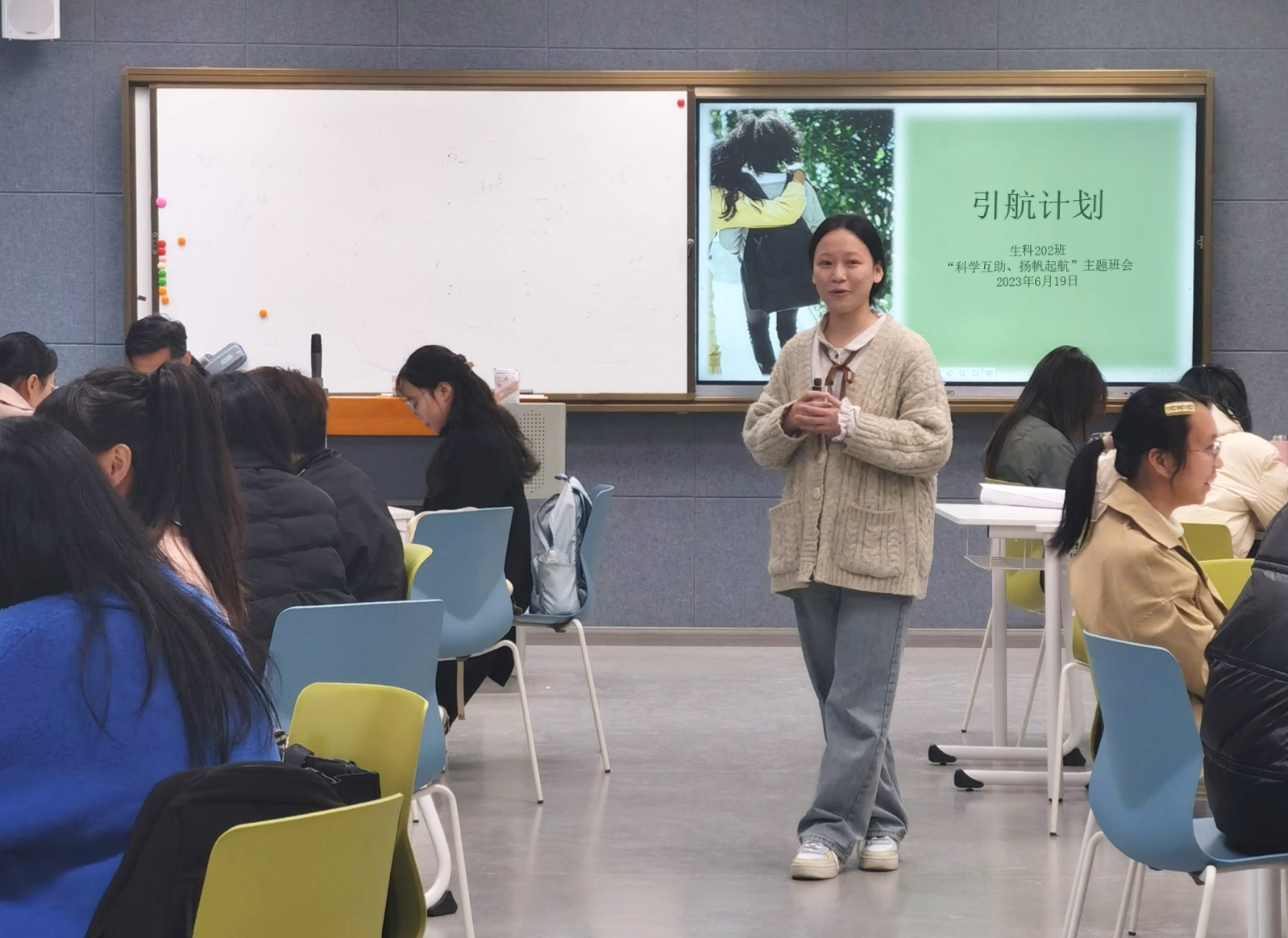 2023年6月5日,在班长的组织下,91制片 202全体同学以及班主任赵老师来到诚园的智慧教室中,共同参与了本次“引航计划”的班会活动。