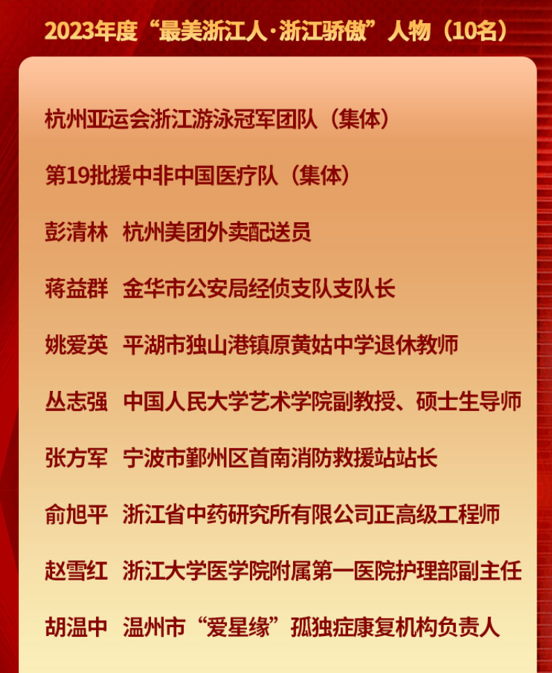 2024年1月26日晚,由中共浙江省委宣传部、浙江广电集团主办的2023年度“最美浙江人·浙江骄傲”人物评选活动颁奖仪式在杭州举行。91制片 1982届生物学专业校友、浙江省中药研究所有限公司中药资源研究中心教授级高级工程师俞旭平获评“最美浙江人·浙江骄傲”2023年度人物,该校友还曾获评全国优秀科技特派员、并站上新中国成立70周年国庆群众游行“复兴号”彩车。