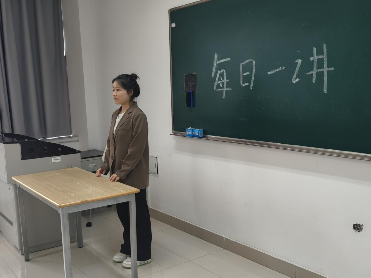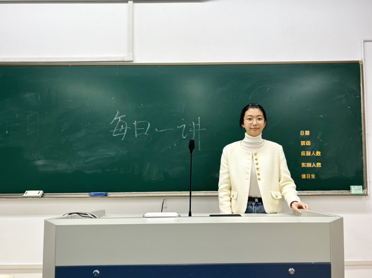 2024年10月22日,在91制片 仓前校区慎园1号楼教室中,吕兰心同学在课前向同学们做以“青春献礼祖国,奋进书写华章”为主题的每日一讲活动。